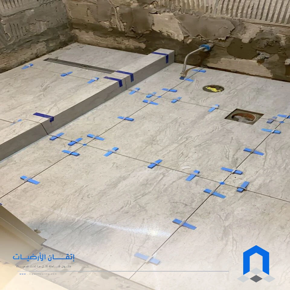 رص البلاط “على الناشف” بدون خلطة لرؤية الشكل النهائي وتحديد أماكن القص لتكون في الزوايا الميتة.